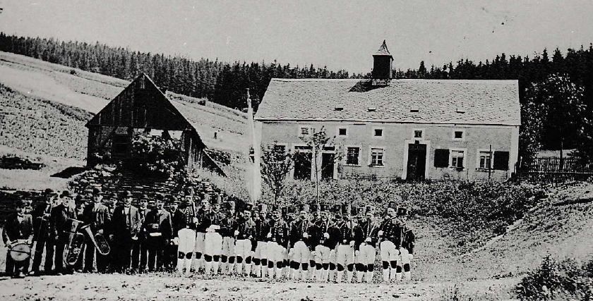 Huthaus mit Treppenaufgang Anbau Hinterhaus (Foto nach 1882 weil bereits Pulverturm vorhanden)Huthaus Frontansicht 2 Haupteingänge Nebengebäude querHuthaus ca. 1911Huthaus Frontansicht 3 Haupteingänge Datierung unklar, möglicherweise Zeit vor Sprengunfall 1882 ? Nebengebäude längs